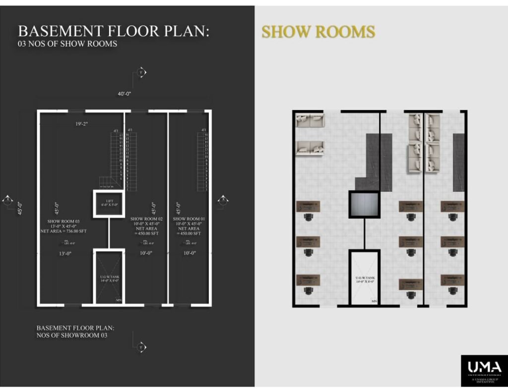 The ground and basement floors house three high-ceiling showrooms — each with 16 ft height, making them perfect for retail, brands, or offices. The available sizes are 450 sq ft, 450 sq ft, and 736 sq ft, priced at Rs. 50,000 per sq ft.