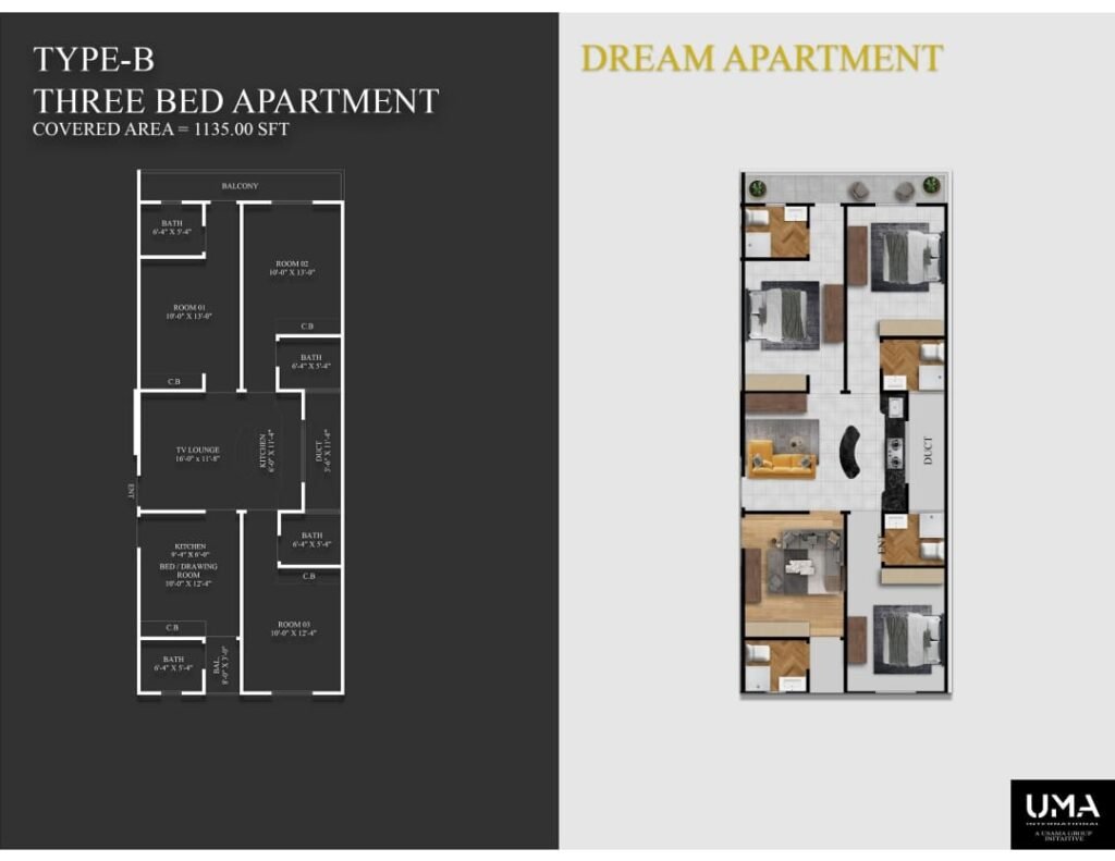- 3-Bed Apartment (1135 sq ft) – Rs. 2.00 Crore