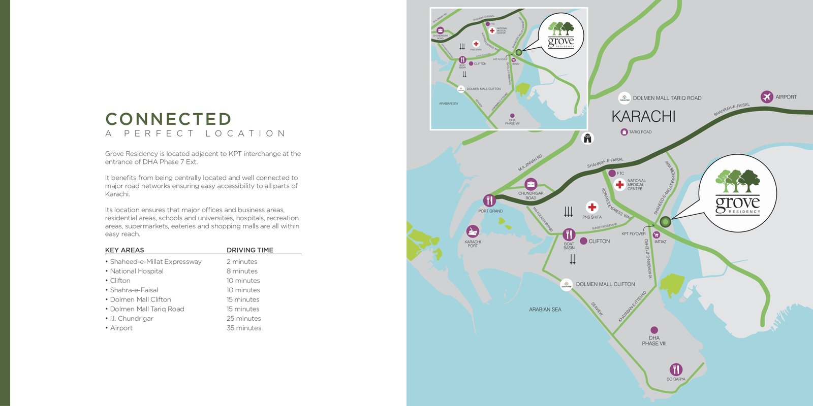 Location is one of Grove Residency’s strongest features. It sits adjacent to the KPT Interchange at the entrance of DHA Phase 7 Extension. This central positioning allows residents to access all major areas of Karachi within minutes. The project is equally attractive for professionals, families, and students due to its unmatched connectivity.