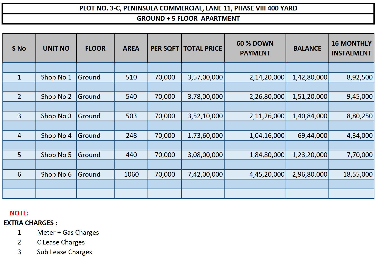 Located at Plot No. 3C, Lane 11, Peninsula Commercial, DHA Phase VIII, this mixed-use project is developed on a 400-yard plot. It features: